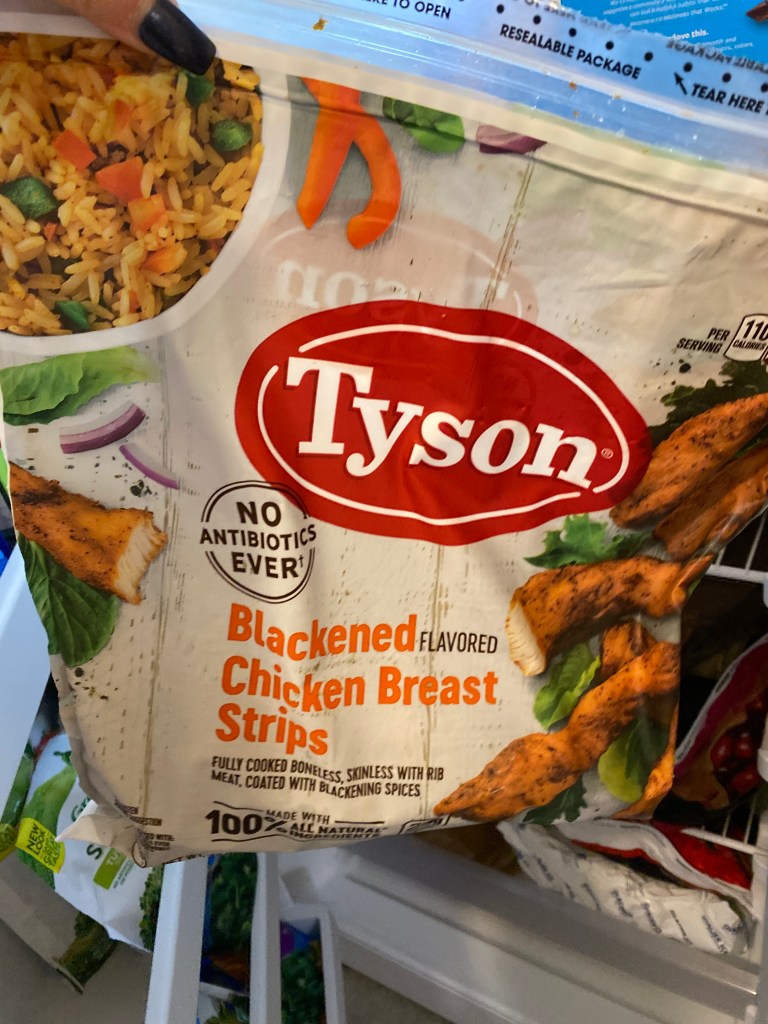 Once zucchini noodles are made and in the freezer I move on to portioning my lunch protein out for the week. I don’t have to do this every week as the large bags of precooked chicken from Costco last a few weeks. Our favorite precooked chicken at the moment is Tyson Blackened Chicken Strips. They have a great flavor and are zero points! In our area they have big bags at Costco and I’ve heard they’re also available at HEB.