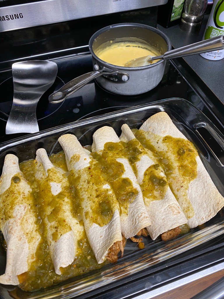 Divide mixture among the wraps and place in the casserole dish with the seam down, top with remainder of salsa verde. A typical 9×13 pan will fit 6, for a full 8 to fit you’ll need a bit bigger pan or two pans. Finish in oven for 20 minutes. Plate and top with plant-based queso.